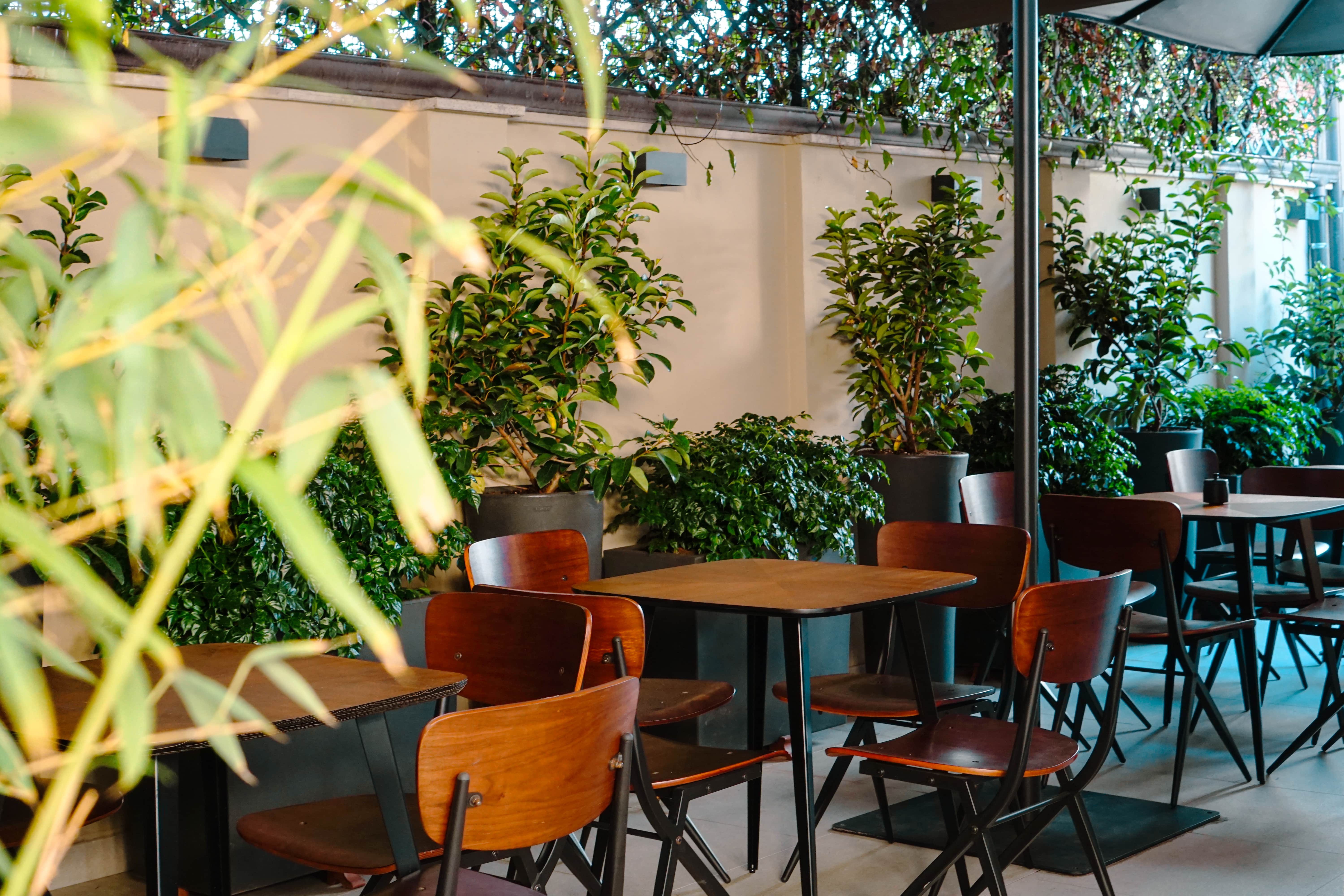 Un piccolo cortile immerso nel verde offre un rifugio silenzioso e defilato: il luogo ideale per chi desidera gustare in tranquillità un momento di autentico relax.