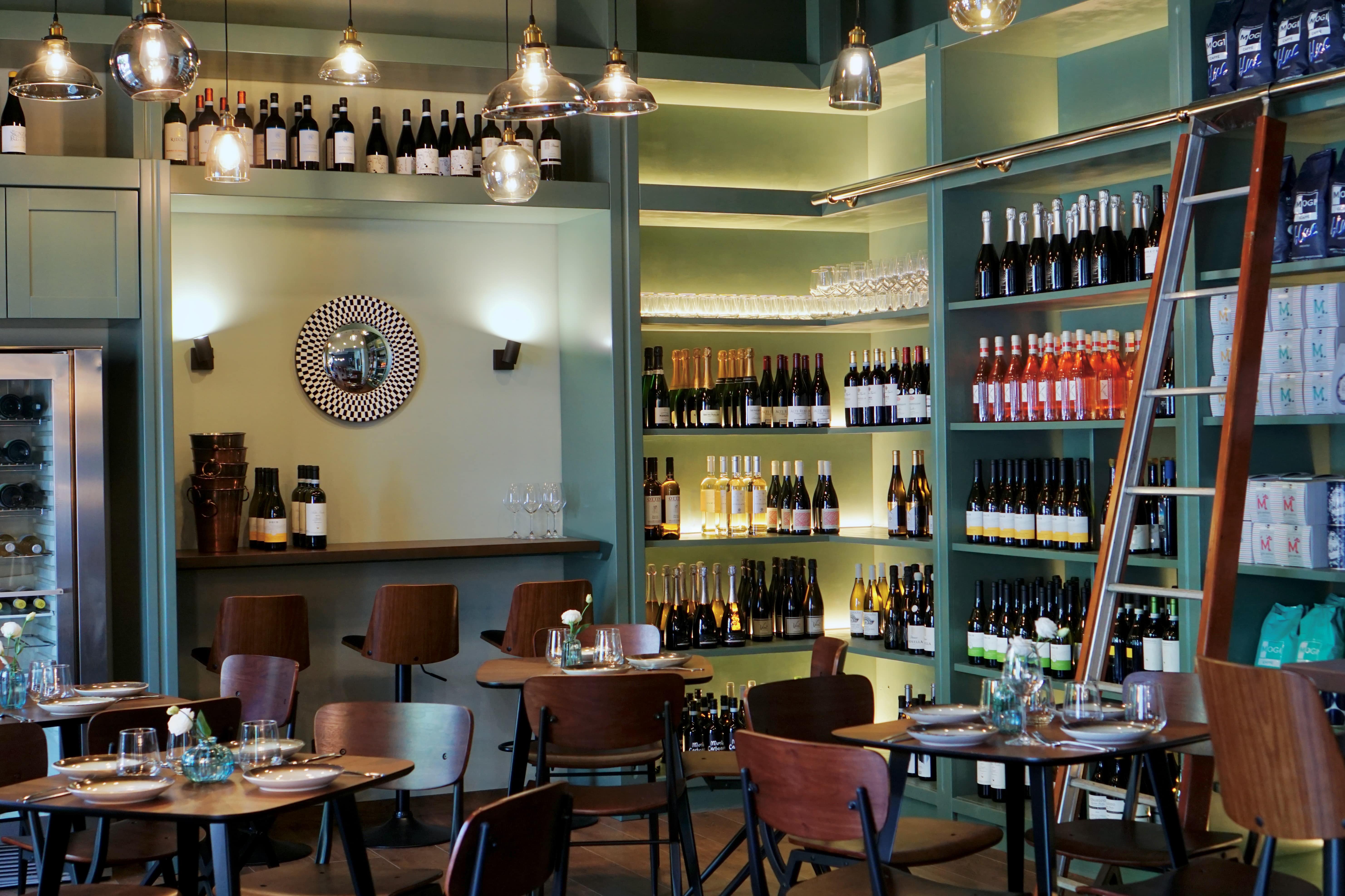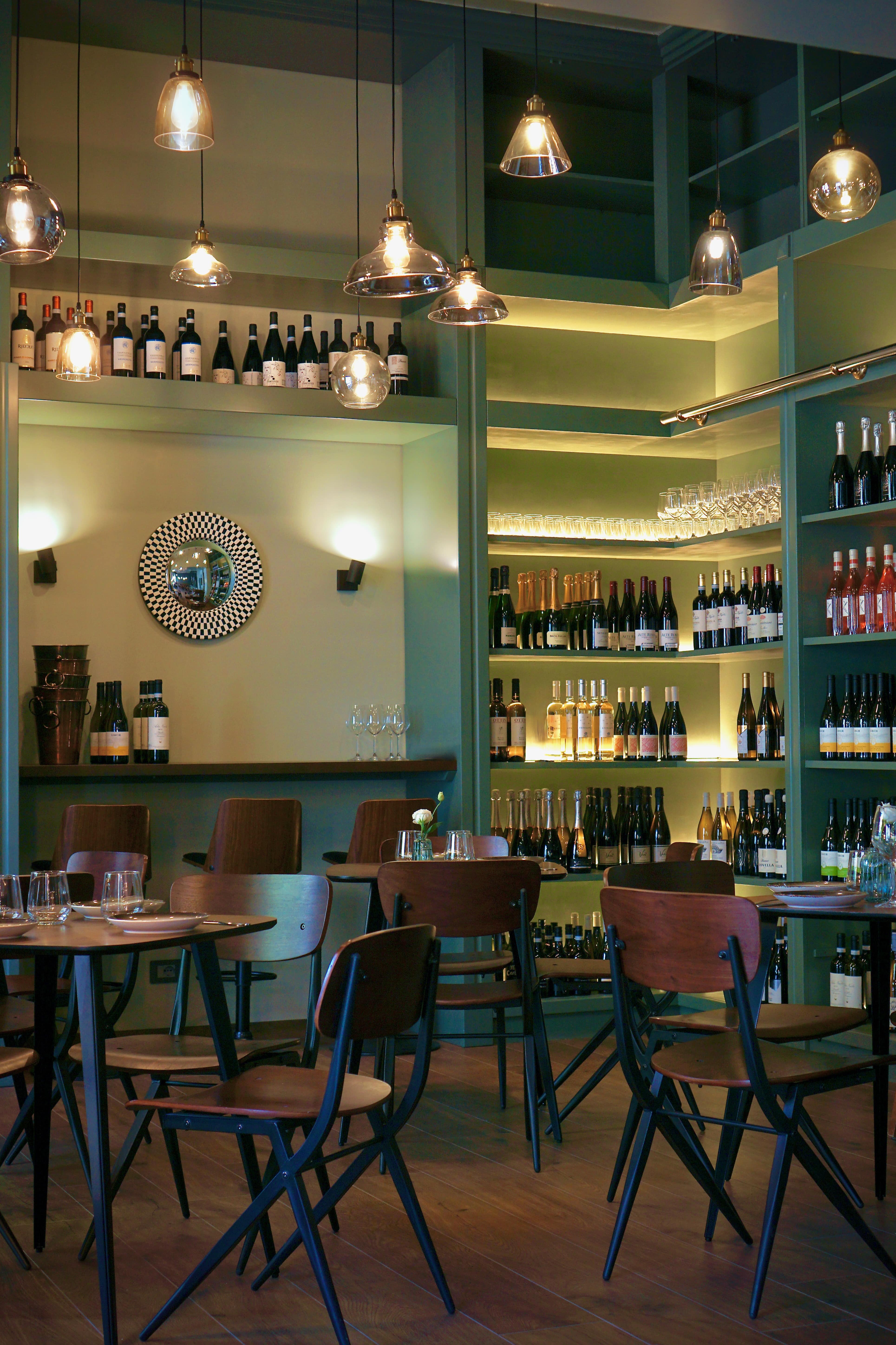 Un’atmosfera intima accoglie gli ospiti tra tavoli in legno scuro e sedie di designer italiani degli anni ’50. Gli alti scaffali che circondano la sala fanno da vetrina ai vini e ai prodotti in vendita: caffè, composte, conserve e sottoli selezionati.